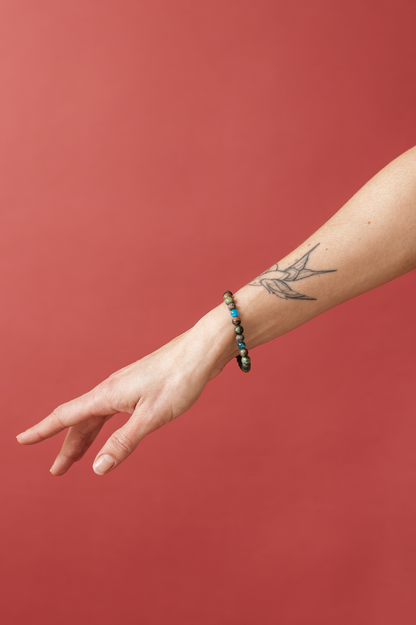 De Unakite armband is een prachtige combinatie van natuurlijke edelstenen: raw green amber, apatiet, turkoois en unakiet.
