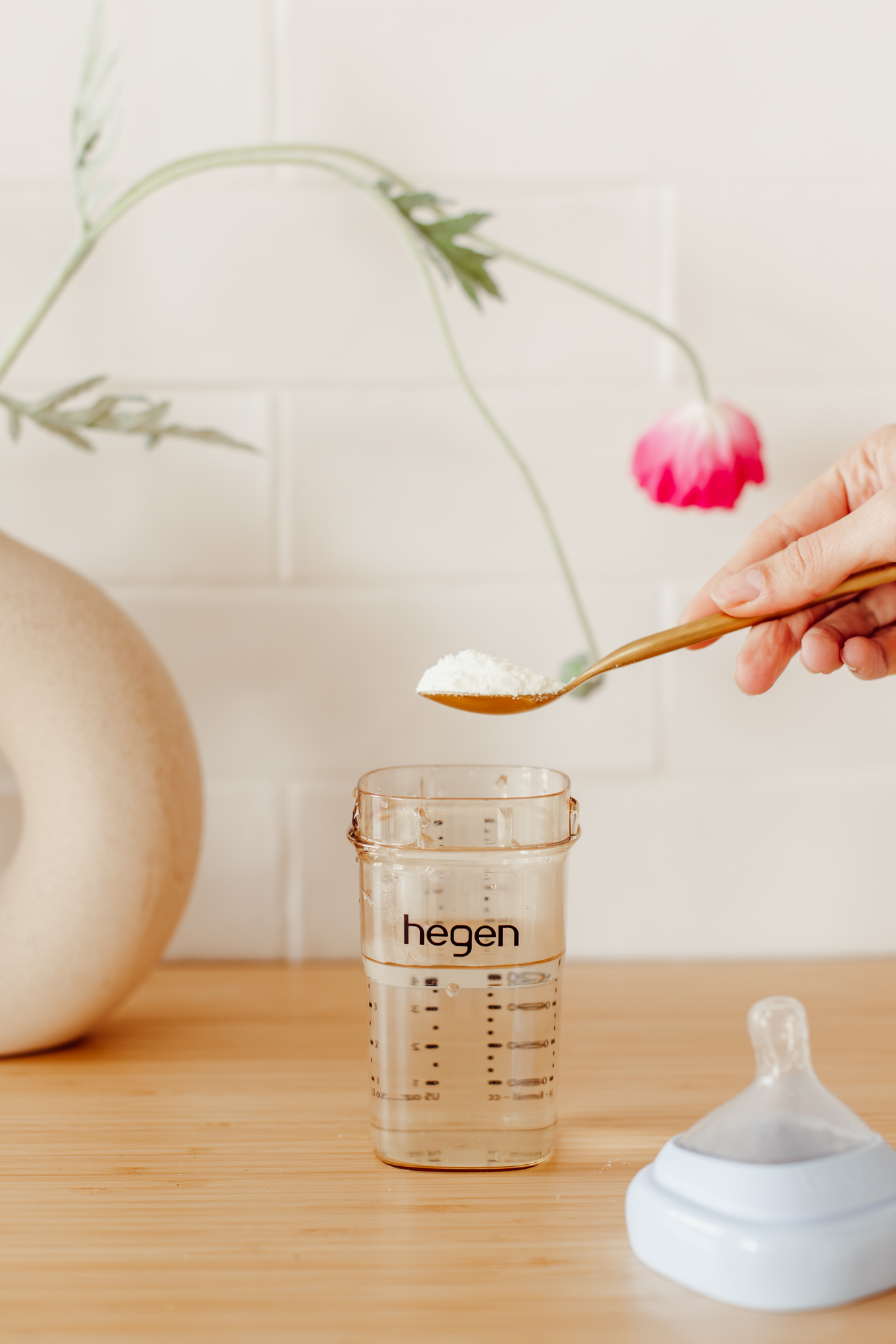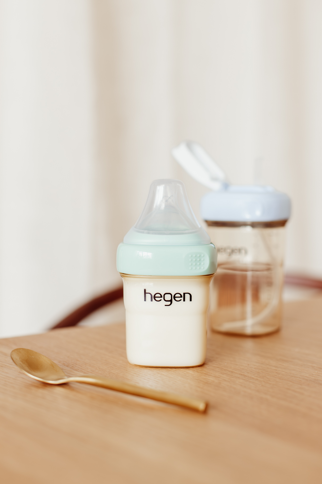 • Wanneer je het Hegen flesje geeft, is het belangrijk dat het speen tuutje aan de onderzijde zit, omdat de speen asymmetrisch is. Je hoeft onze fles bijna niet te kantelen door deze asymmetrische speen, omdat er altijd melk in het tuutje zit. Heel fijn omdat er zo geen extra lucht mee komt met de voeding, en je het kindje (wanneer je dit wilt) therapeutisch kunt voeden.