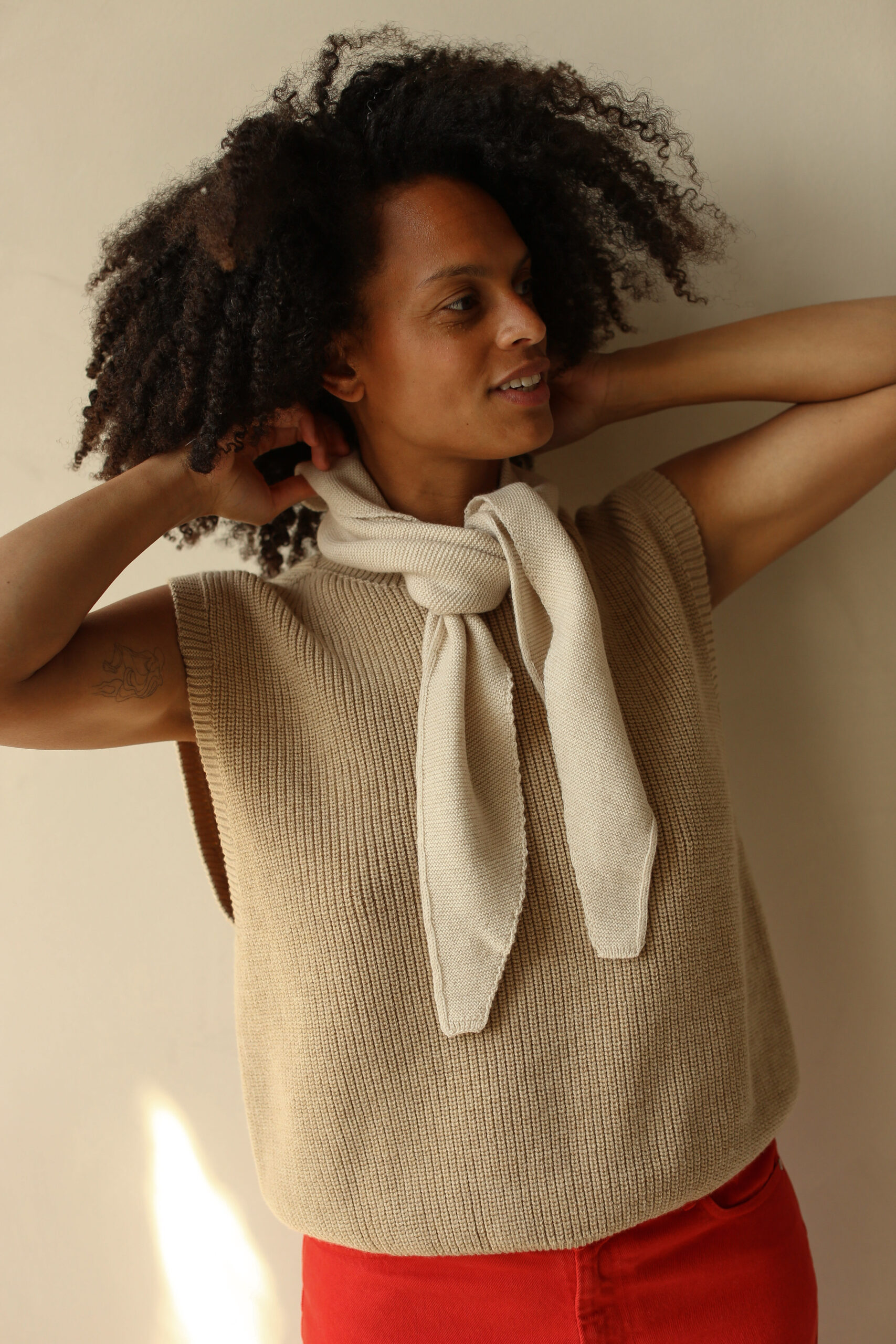 Een lichte, zachte driehoekssjaal. Deze fijngebreide sjaal heeft een strakke driehoekvorm en een compacte, elegante uitstraling. Dankzij de spitse uiteinden knoop en verstel je hem moeiteloos. Draag hem om de nek of over het hoofd: veelzijdig, comfortabel en ideaal om te layeren op koelere dagen. Een tijdloos accessoire dat elke outfit verfijnt en subtiel laat opvallen. One size, fits all!
