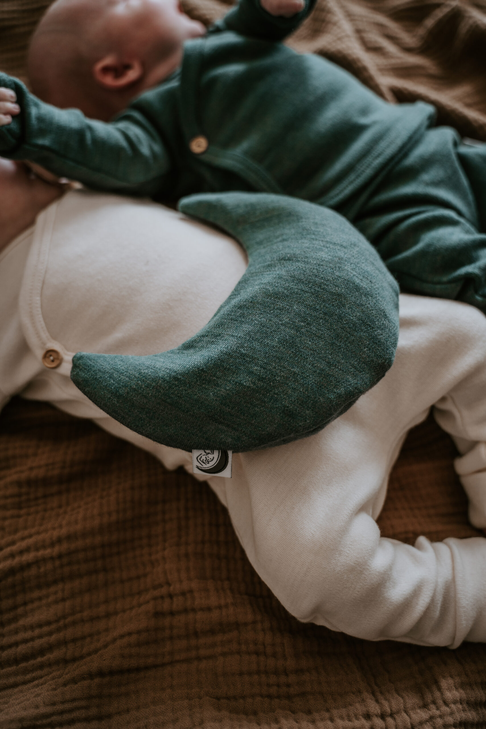 Het Warmtemaantje in merinowol is de moderne en comfortabele variant op de klassieke babykruik. Dit handgemaakte, maanvormige warmte pittenzakje is gevuld met biologisch gereinigde druivenpitten en kan zowel warm als koud gebruikt worden. De zachte merinowollen hoes in de kleur Sage geeft een warme, rustige uitstraling en maakt het Warmtemaantje niet alleen een fijn hulpmiddel, maar ook een prachtig decoratief item in de babykamer.